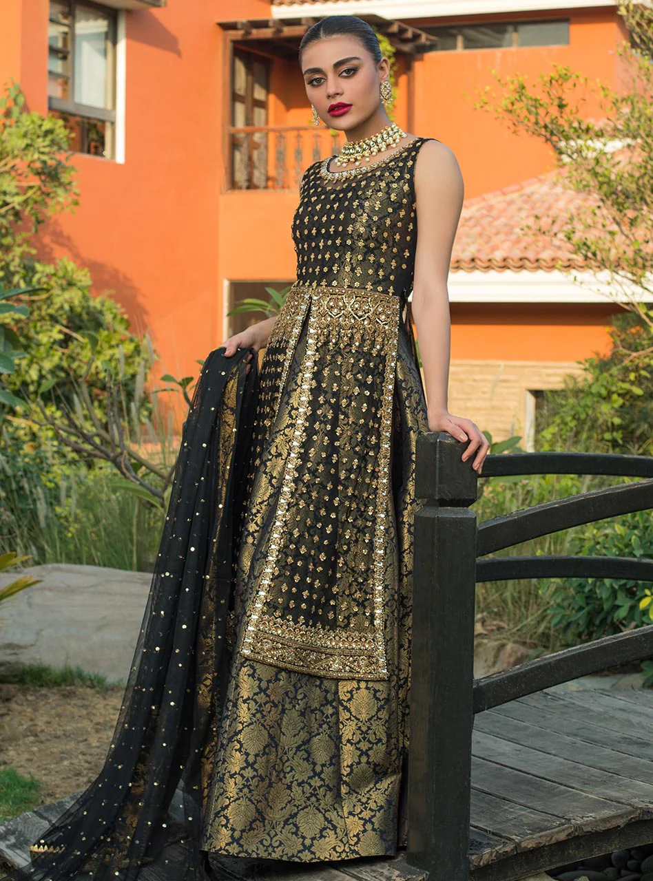 Perfected with gold, antique gold and silver embellishments this black net ensemble is timeless master piece in to a chic fantasy. It is coordinated with jamawar sharara. Dupatta: It comes with a black net dupatta with sequins sprayed all over it along with jamawar finishing on all four sides.