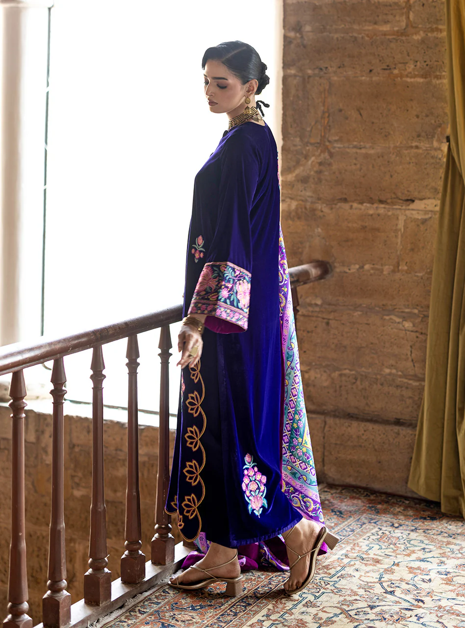 A luxurious creation where profound depth meets vibrant spectacle. Crafted from sumptuously soft Deep Royal Purple Velvet, the outfit offers a silhouette of sophisticated grace. It is dramatically elevated by a magnificent silk dupatta, a canvas of digitally printed artistry. Here, bold fuchsia, serene teal, and lush emerald intertwine with intricate floral embroidery, creating a dynamic visual symphony that perfectly complements the velvet's rich hue. This piece is a modern ode to traditional luxury, designed for the discerning individual who seeks an impactful and color-rich statement.