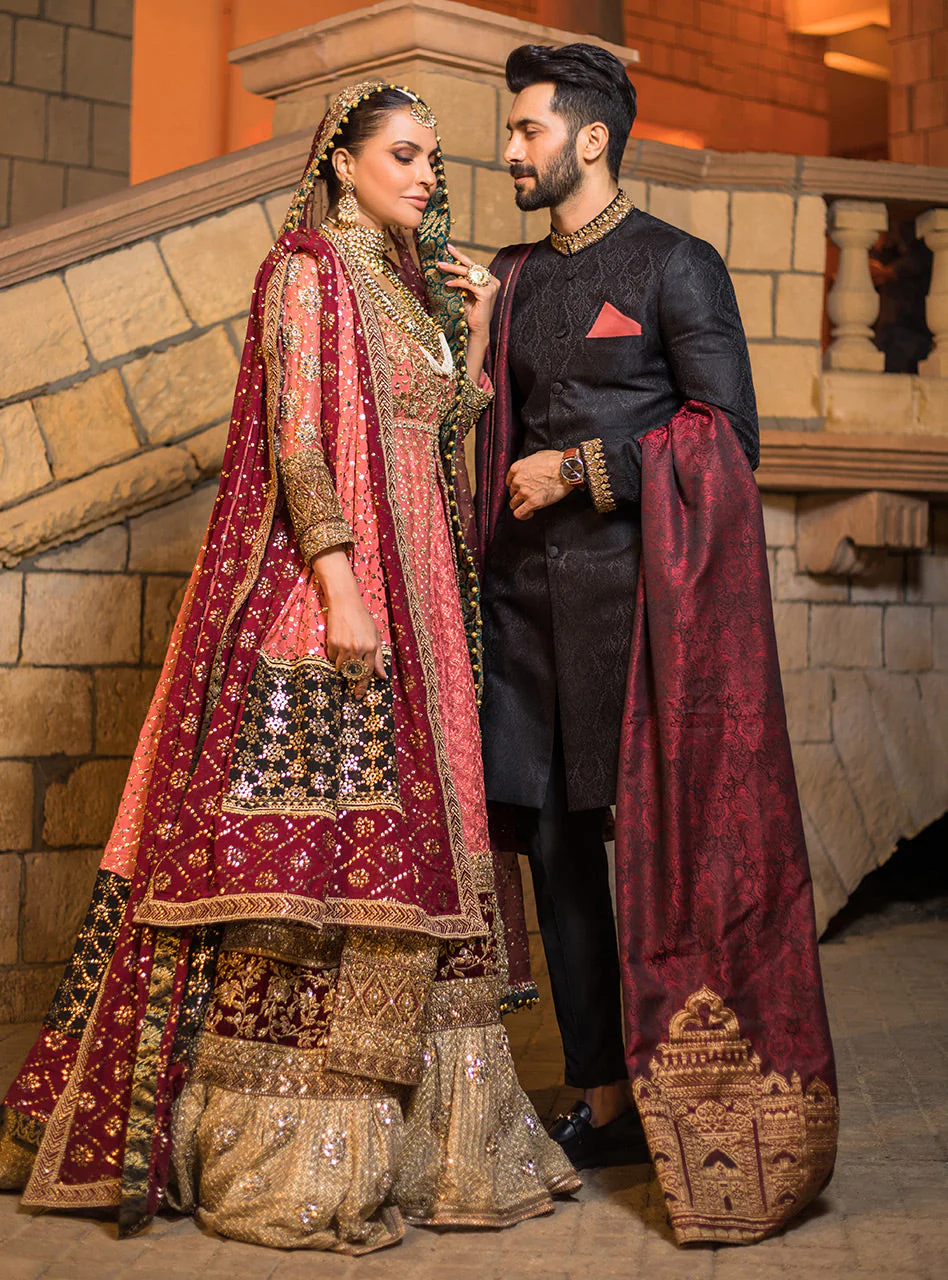 Our black jacquard sherwani allured with embellished collar, sleeves border and maroon pocket square is all set to make you chic yet elegant.