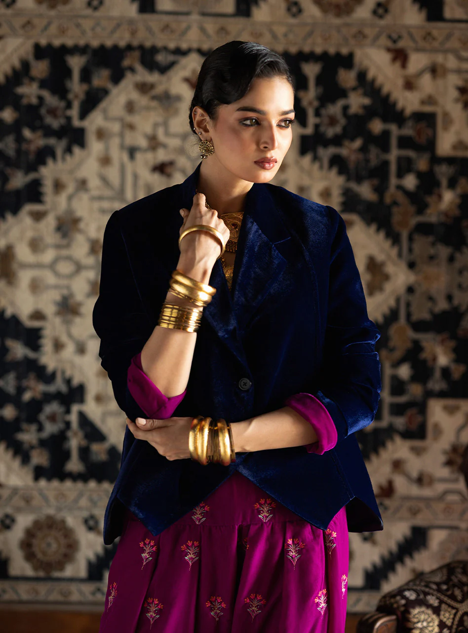 A sophisticated, high-fashion fusion ensemble perfect for making a bold statement. This striking piece features a tailored Deep Navy Blue velvet blazer jacket, designed with a sharp lapel and a subtle floral thread-work motif across the back for an unexpected touch of artistry. The modern tailoring beautifully contrasts with the traditional Magenta shalwar, which is richly adorned with intricate embroidery, showcasing a vibrant, festive energy.