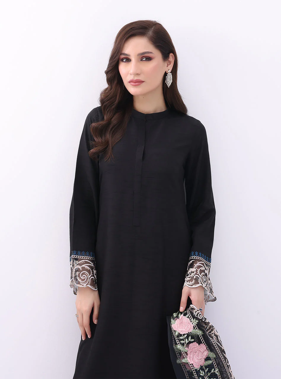 Douse into this enticing embroidered canvas. Embroidered border along the daman and sleeves, make this an elegant silhouette to flaunt.