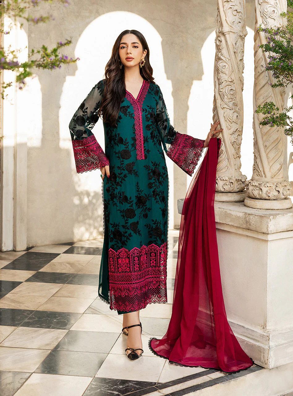The emerald green chiffon shirt, adorned with intricate black embroidery, shimmers with an ethereal elegance. A delicate pink embroidered neckline and matching pink borders on the sleeves and hemline add a touch of femininity. The viscose pants provide a luxurious drape, while the pure chiffon dupatta, finished with a delicate lace, adds a touch of ethereal grace.