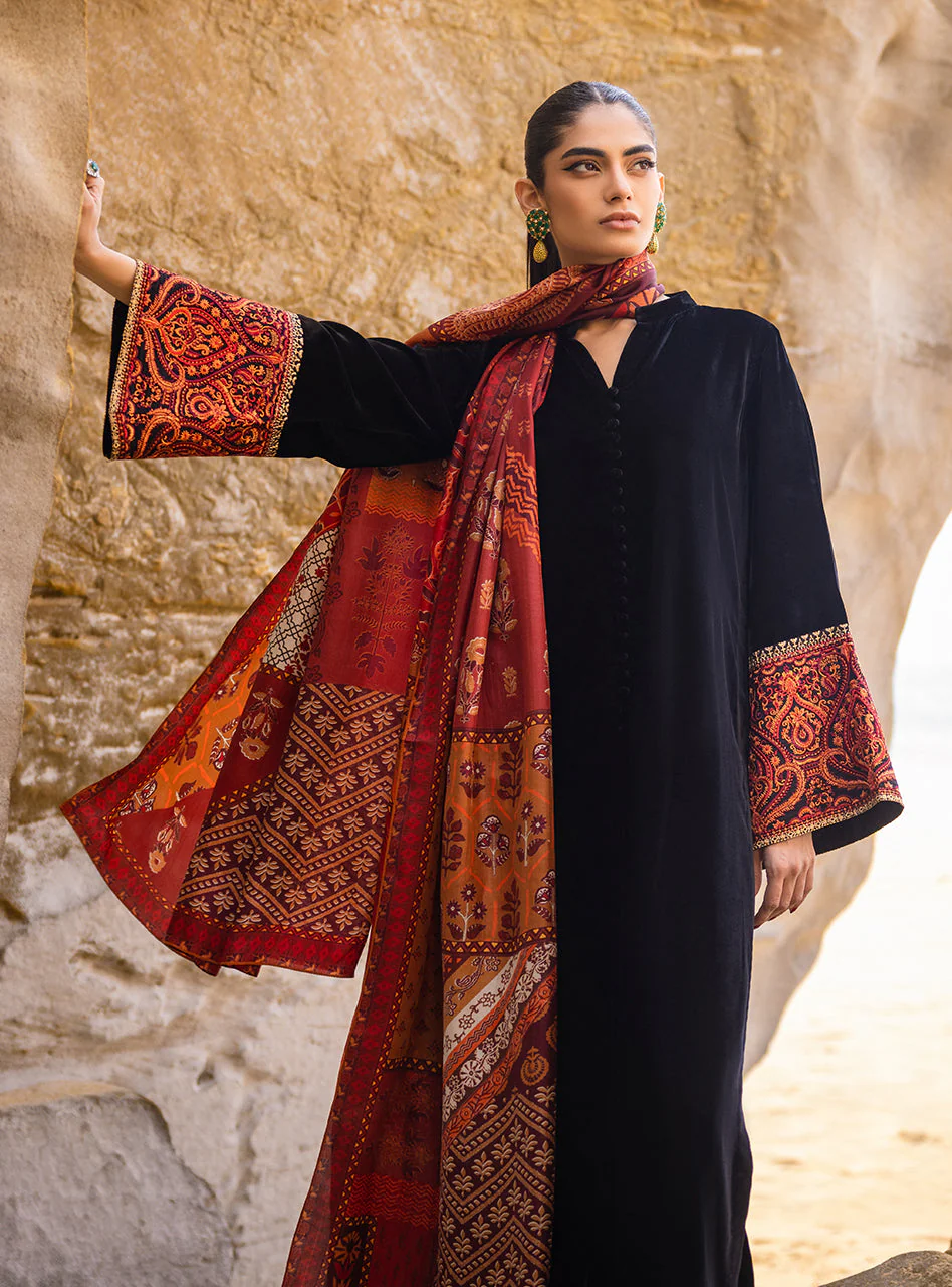 Look exceptionally regal in this deep black velvet front open jacket embossed with a dose of red and gold traditional embroidery embodying grace. Prepare to witness a timeless staple in your elegant winter wardrobe.