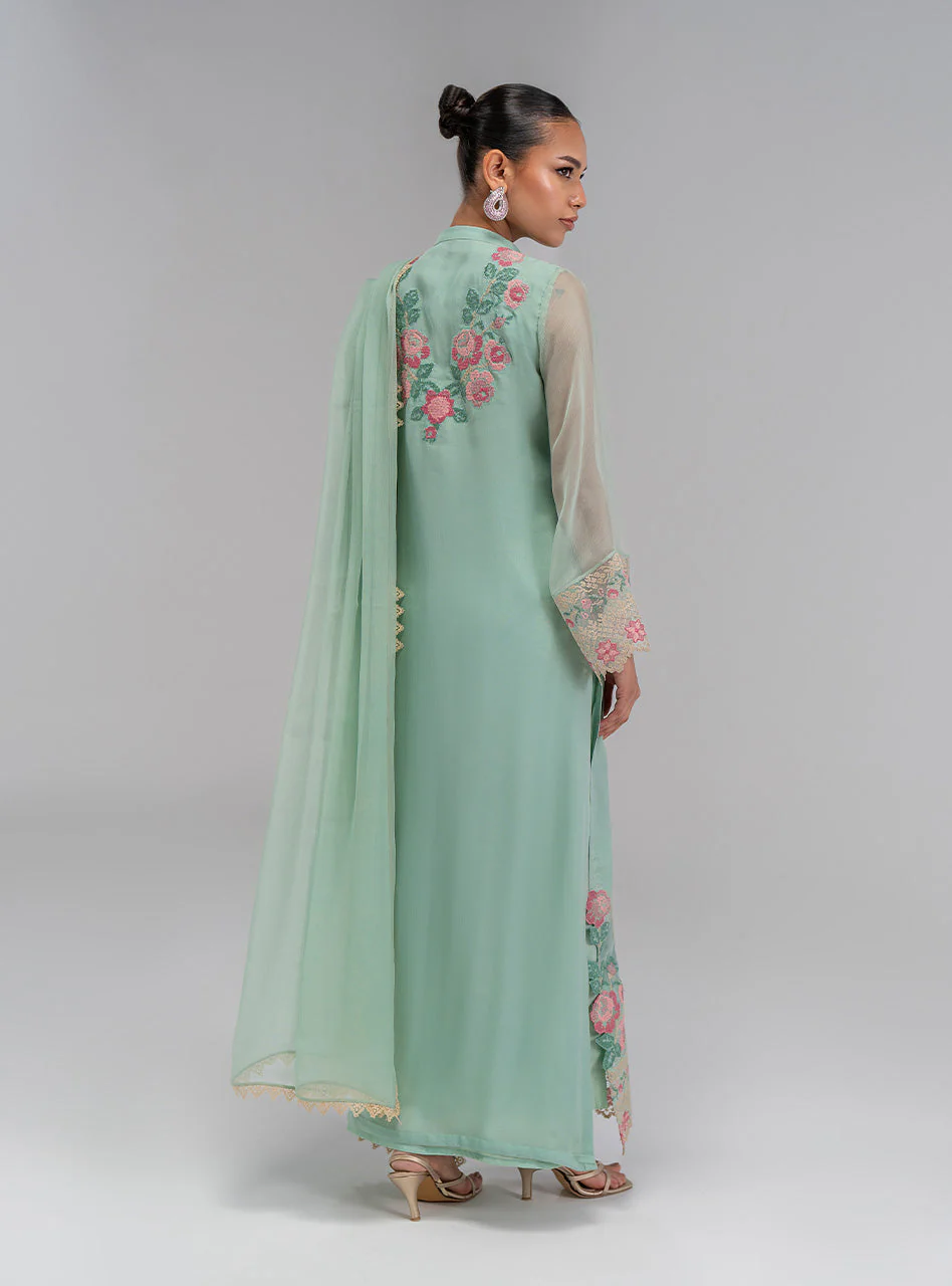 This breathtaking mint green outfit is crafted from the most beautiful, flowy fabric, chiffon, making you feel elegant and comfortable all day long. The long shirt silhouette offers a graceful and classic look, perfectly complemented by delicate floral embroidery with soft pink and green flowers that wind around the neck, sleeves, and hem. Complete with its lovely dupatta and perfectly matched trousers.
