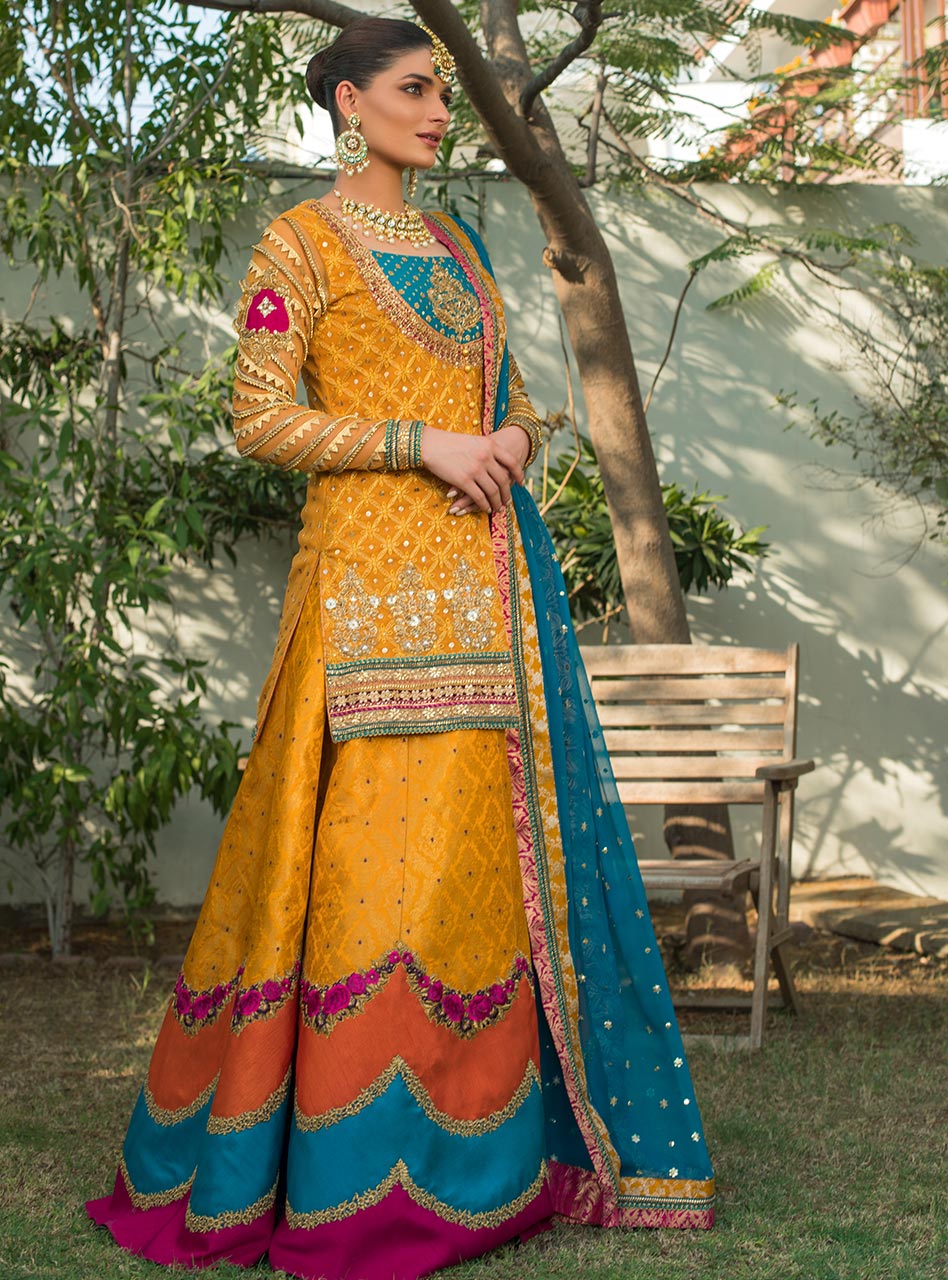 The perfect choice for Mahendi A front open short shirt is heavily adorned with embellished neckline and border with kora, dabka sequins and gota. The sleeves are further more enhanced with red floral and gota detailing. This amber opal sharara is allured with colorful scalps highlighted with intricate thread embroidery. Teal chiffon dupatta has chann and sequins flowers all over and is finished with jamawar and gota detailing all around the edges.