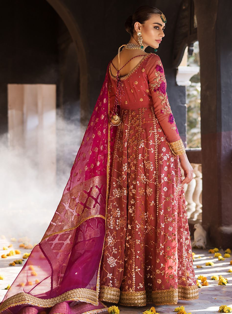 This glamorous and beautifully bedazzled rose pink anarkali is embellished with antique gold kora dabka and gota. The sleeves are beautifully enhanced with a colourful floral motif.The outfit is beautifully enhanced with magenta organza Maysuri dupatta.