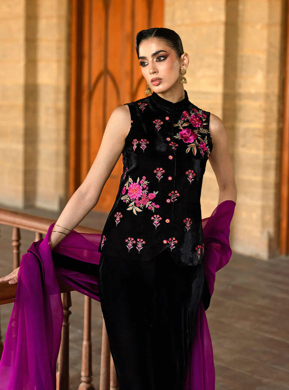 Keir vest and pants, a powerful, modern three-piece ensemble crafted from sumptuously soft black velvet. The tailored, sleeveless vest (koti style) features intricate floral thread-work embroidery in vibrant magenta and deep pink, adorning both the front and back for a luxurious finish. This dramatic look is completed by high- waisted, wide-leg velvet trousers that create a flattering silhouette, and a embroidered magenta dupatta with a velvet border that adds a bold pop of colour.