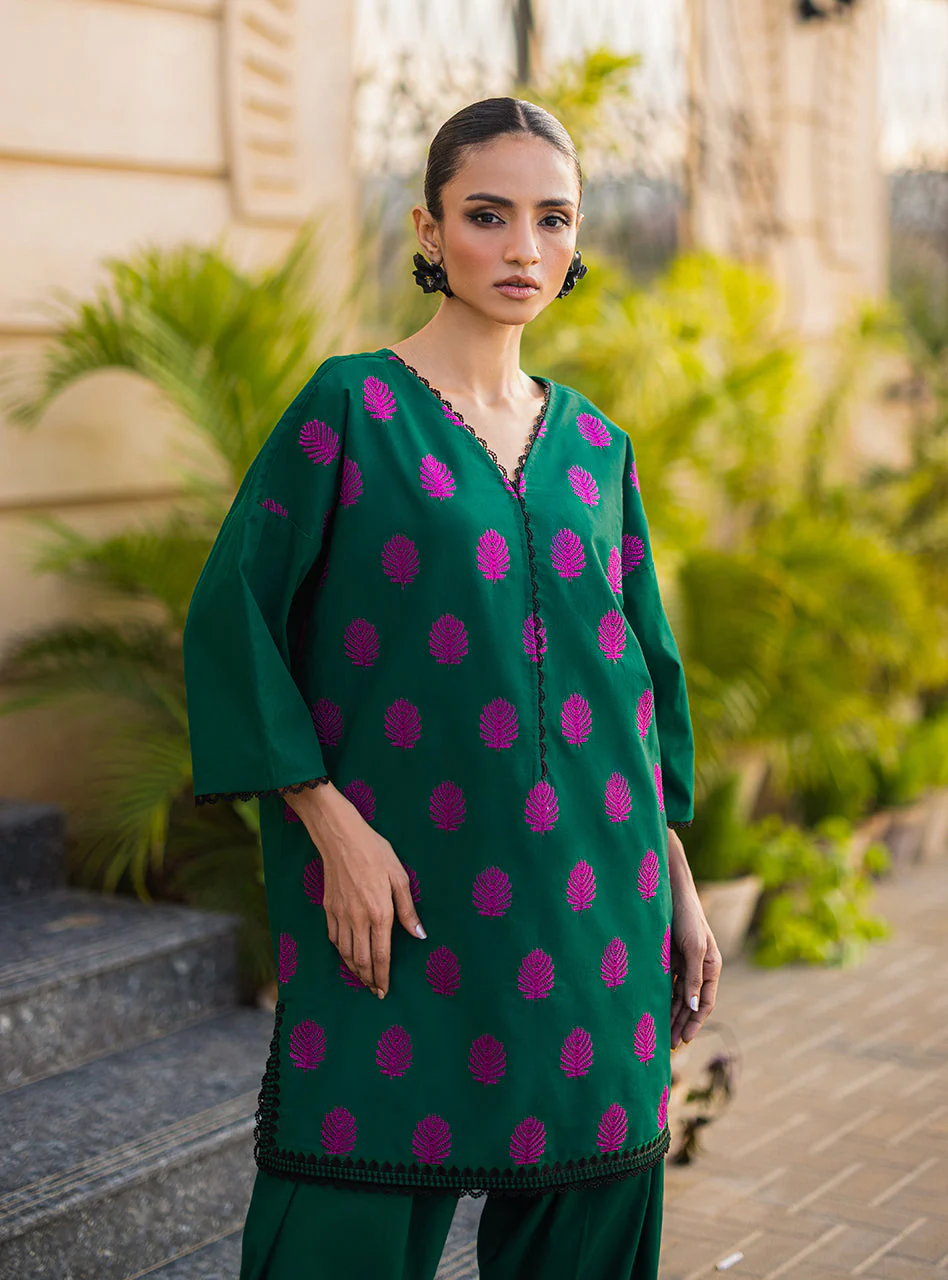 Brighten up your wardrobe with this delicate and lacy creation richly made with fusion of charm, The embroidery features graceful motifs, adding a pop of vibrant color to the shirt. The juxtaposition of the green base with the lively pink embroidery on front and back, paired with matching shalwar creates a striking contrast, making this look truly eye-catching.
