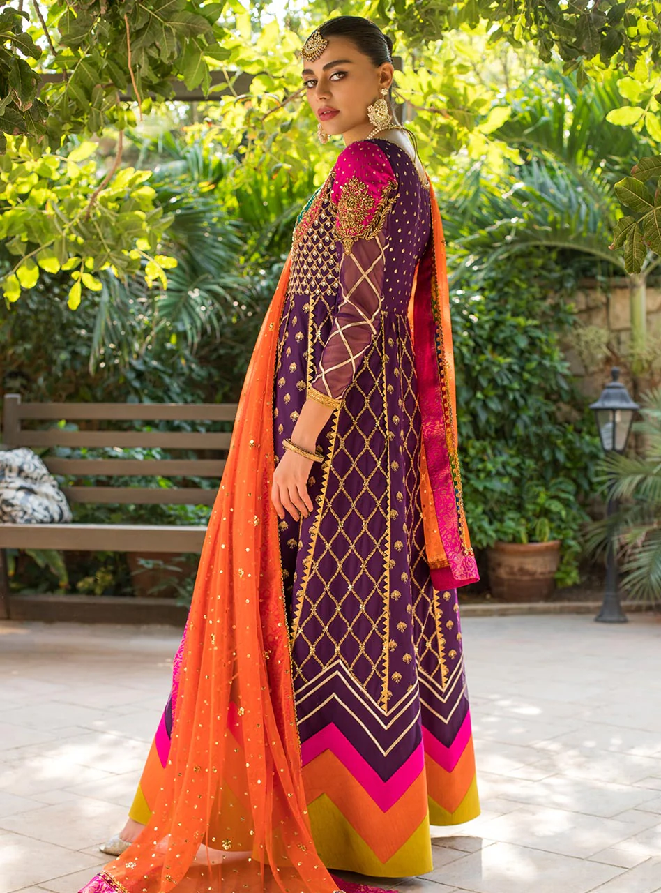 Take a twirl in this stunning anarkali embellished with kora dabka and intricate gota detailing finished with colorful chevrons. The outfit is beautifully enhanced with orange dupatta that has chann all over and is finished with jamawar and gota all around the edges.