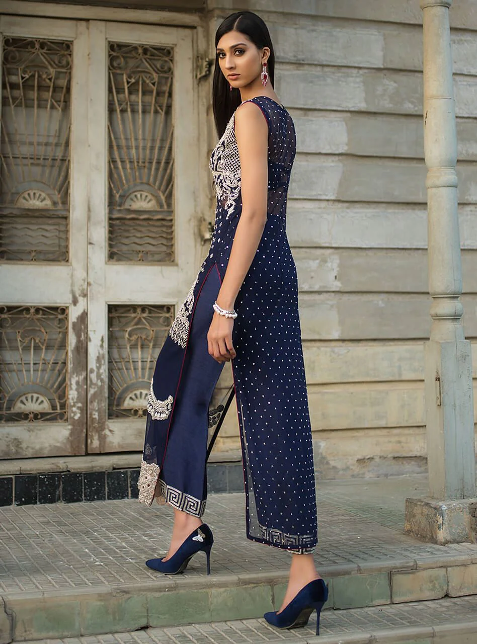 Look alluring in our NAvy blue long shirt embellished with floral motifs in silver kora dapka, pearl and kundan. The borders on the daman are enhanced with cutwork detailing that instantly draws attention.