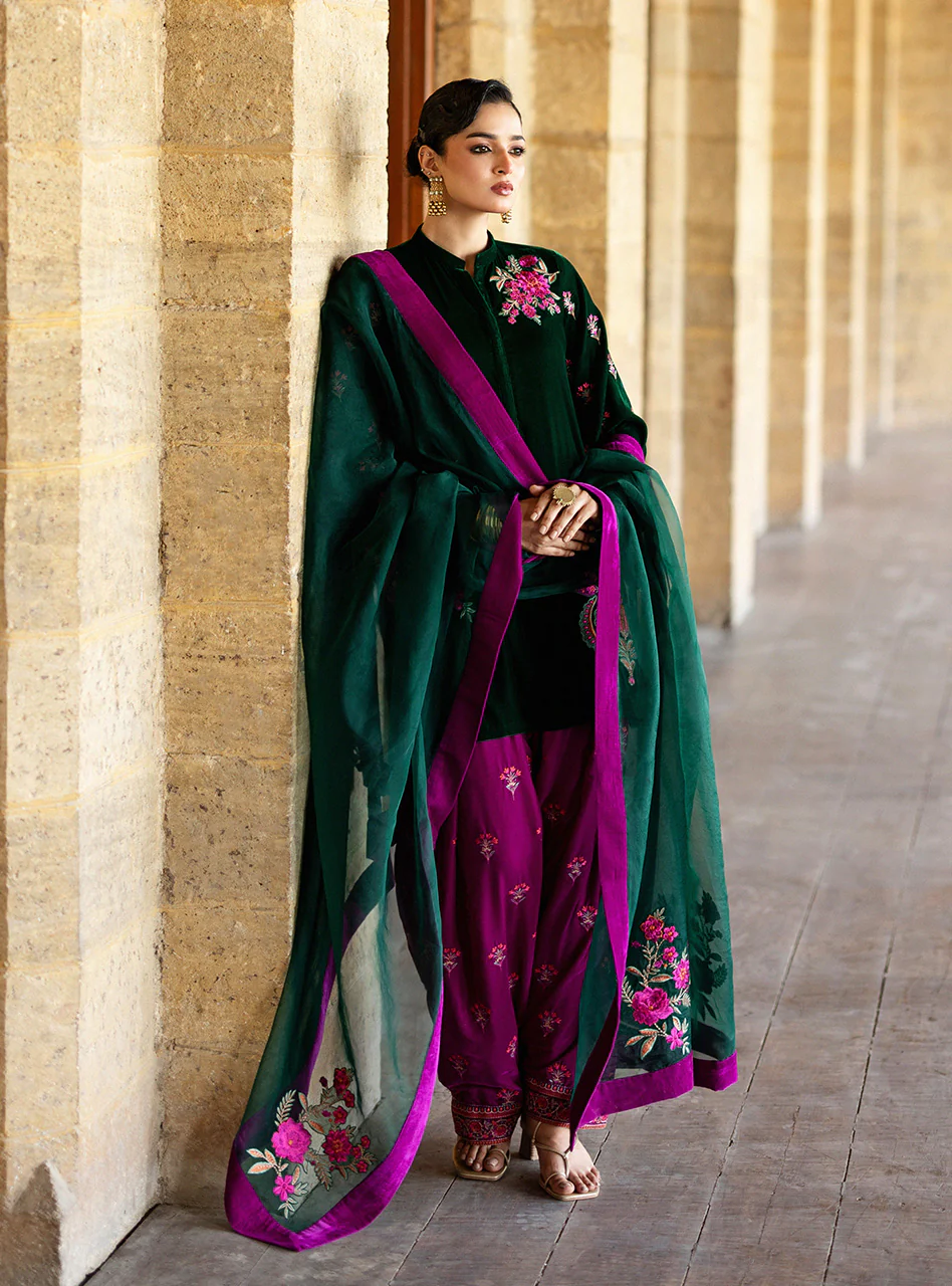 The luxurious Emerald Green velvet kurta features a refined high-neck and is richly adorned with intricate floral thread-work embroidery across the front, sleeves, and a prominent motif on the back. This stunning look is boldly paired with a vibrant magenta velvet shalwar, which is beautifully embellished along its cuffs, and finished with a sophisticated emerald green organza dupatta with embroidery.