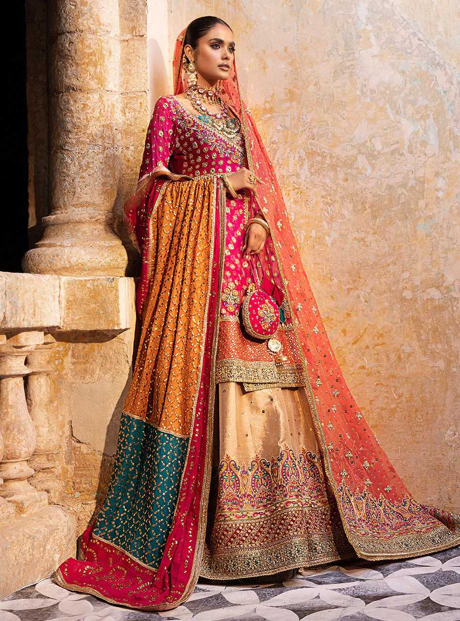 It is paired with magenta dupatta, finely decorated with floral motifs and intricate borders.