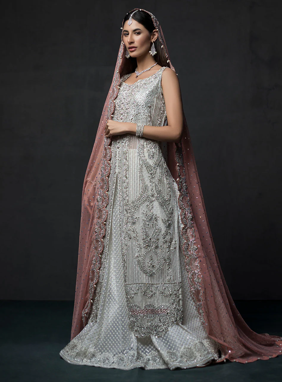 Crafted with love, this outfit is surely going to make your day! Beautifully adorned with silver work, this long tunic is paired with a lehenga and contrasting dupatta, elevating the look of the attire.