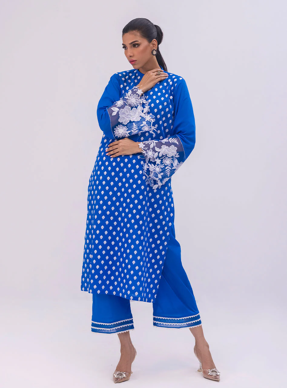 This stunning blue co-ord set features an elegant shirt adorned with delicate white motifs throughout, creating a harmonious blend of color and design. The intricate cutwork detailing on the sleeves adds a touch of sophistication, making it a perfect blend of style and craftsmanship. Whether for casual or semi-formal occasions, this ensemble exudes timeless elegance while offering a comfortable and stylish fit.