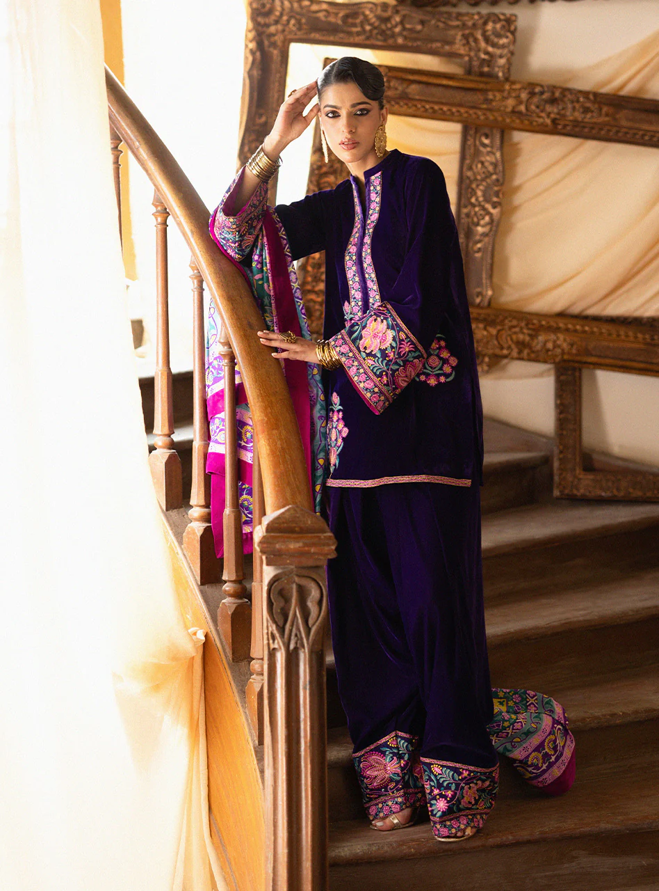 A luxurious velvet three-piece suit crafted from opulent Deep purple Velvet. The shirt and farshi shalwar are adorned with multi colored embroidery on the neckline, sleeves, and wide borders. This majestic design is finished with a striking digital printed dupatta with velvet edging.