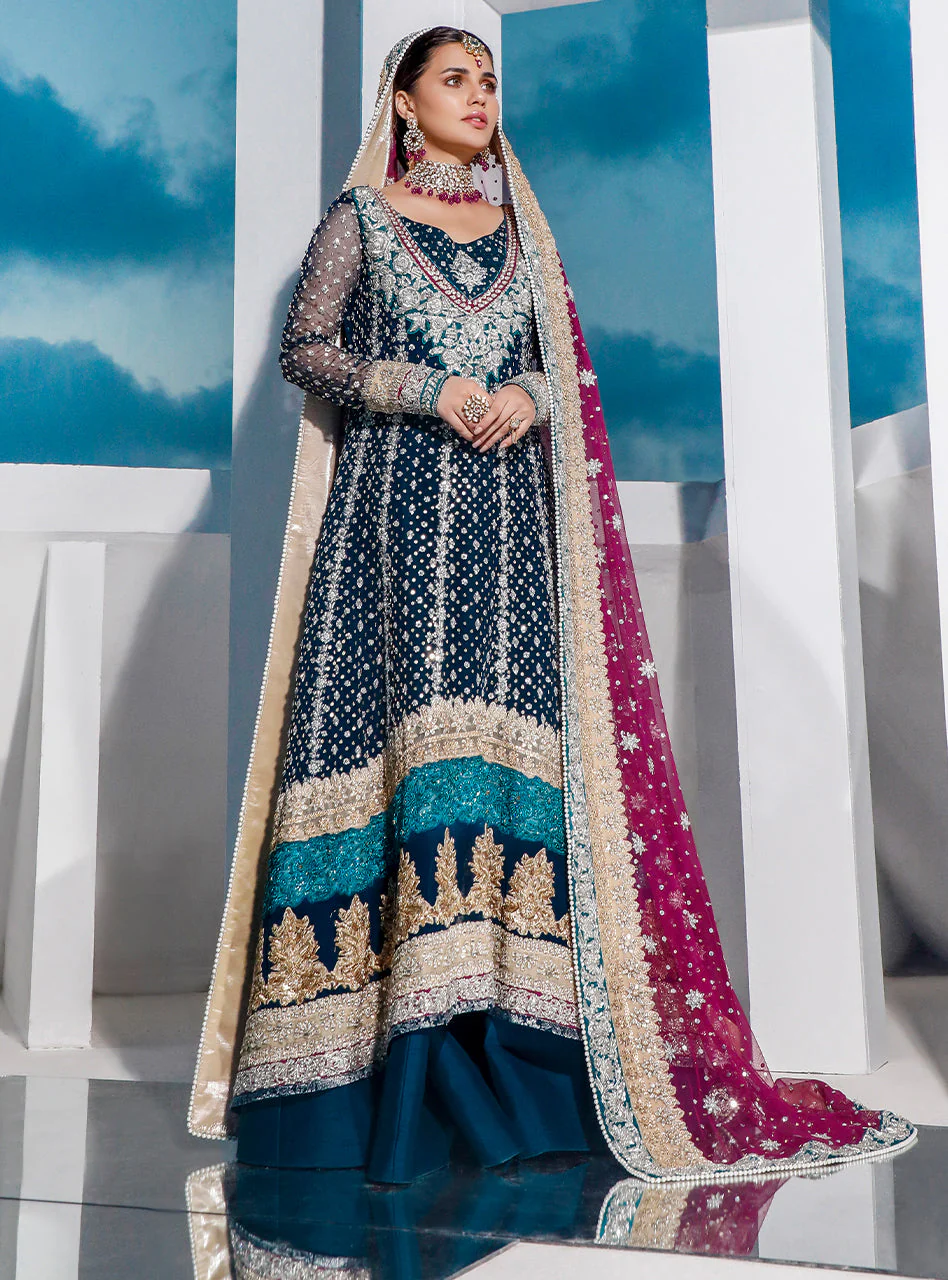 In an elegant ode to tradition this heavily embellished teal gown is allured with floral neckline and intricately embellished borders with kora, dabka, Sequins and kundan work. The flowing gown is further more enhanced with silver sparkle all around.