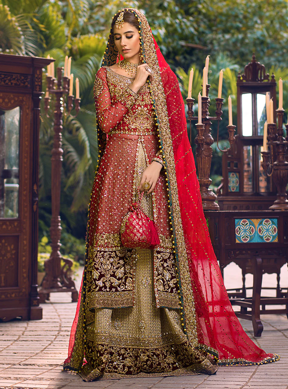 This beautiful bridal outfit is paired with a red organa dupatta decorated with thick embroidered borders on all four sides and Mukesh sequins sprayed all over.